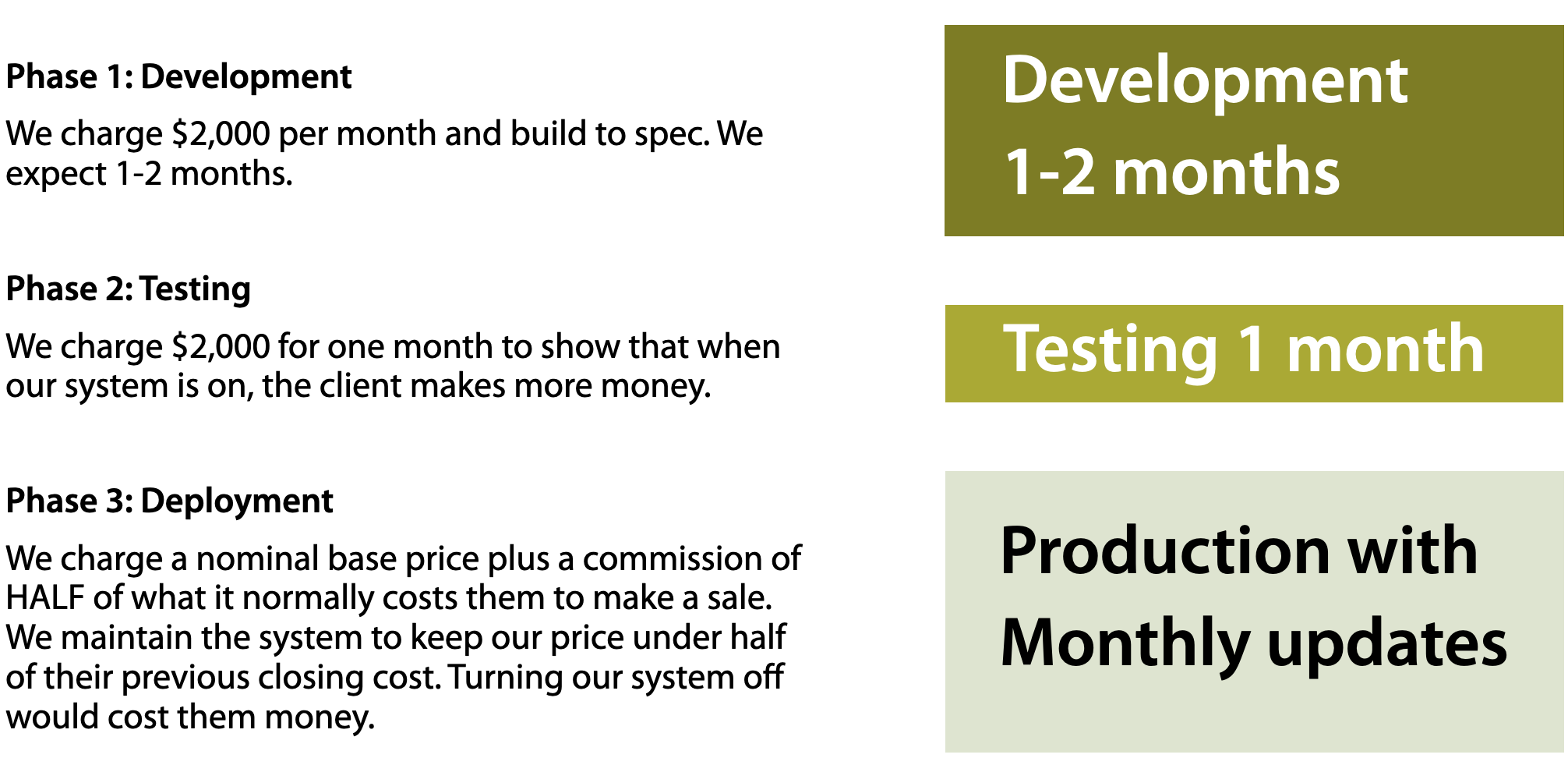 For companies with a significant sales staff, we’ll install a sales bot on your website for free and get paid in commissions. In general, we charge 20 percent of what you’re paying your sales reps to make a sale now. You get full 24/7 coverage, no more funnel building, full CRM and scheduling integration, and complete flexibility. No people problems.