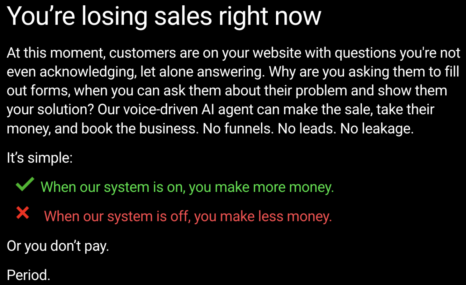 We charge a nominal base price plus a commission of HALF of what it would normally cost you to make a sale. We maintain the system and keep trying to improve it. You get custom software for a few thousand dollars. We take the risk. When our system is on, you’re saving money. When it’s off, you’re spending more money.